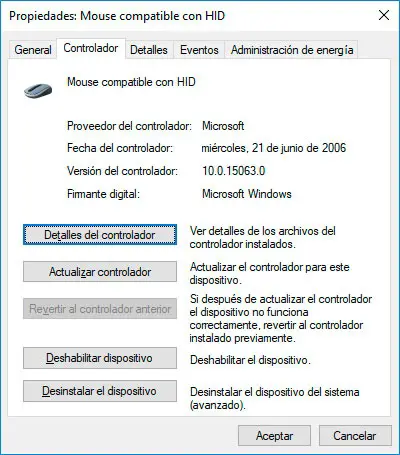 Si tout est correct, depuis l’onglet Matériel, nous allons sélectionner notre souris, cliquer sur Propriétés puis sur le bouton Modifier les paramètres . De là, dans l’onglet Pilote , nous pourrons désinstaller et réinstaller la souris, mettre à jour son pilote ou revenir à une version précédente pour voir si d’une manière ou d’une autre nous résolvons le problème que notre souris ne bouge pas ou ne bouge pas se déplacer. très lentement.