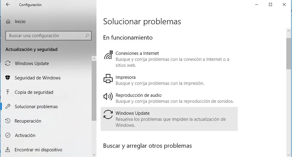 Si après cela, nous voyons que les options de mise à jour et d’ arrêt et de redémarrage et d’ arrêt continuent à apparaître dans le menu Démarrer / Arrêt, nous pouvons utiliser l’utilitaire de résolution des problèmes de Windows Update et voir s’il peut résoudre automatiquement le problème. Pour ce faire, nous ouvrons la page des paramètres de Windows 10, naviguons vers l’option Mise à jour et sécurité> Dépannage , puis cliquez sur Windows Update pour exécuter l’utilitaire de résolution des problèmes.