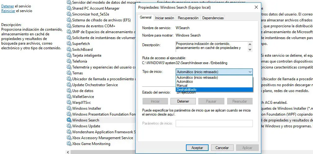 Enfin, si tout cela n’a pas résolu notre problème, nous pouvons essayer de désactiver le service Windows Search, qui est en charge de l’ indexation ou de l’indexation du contenu , de la mise en cache des propriétés et des résultats de recherche pour les fichiers et autres types de contenu. Pour ce faire, nous ouvrons une fenêtre d’exécution, Win + R, et lançons la commande services.msc. Nous recherchons le service de recherche Windows et faisons un clic droit dessus pour entrer ses propriétés et, dans l’onglet Général, changeons son type de démarrage en Désactivé.