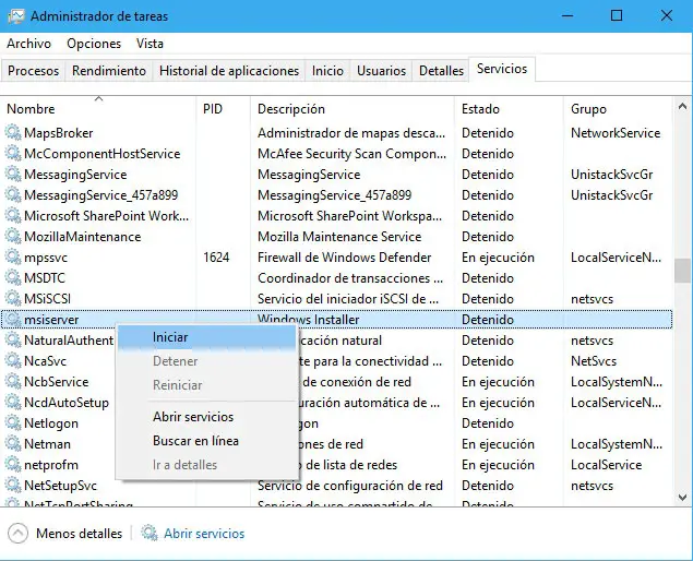Au cas où cela indiquerait une erreur, nous pouvons redémarrer manuellement le service. Nous ouvrons le Gestionnaire des tâches Windows et dans l’onglet Services , nous recherchons msiserver . Une fois trouvé, on clique dessus et on le démarre s’il est arrêté ou on l’arrête et on le redémarre s’il est en cours d’exécution.