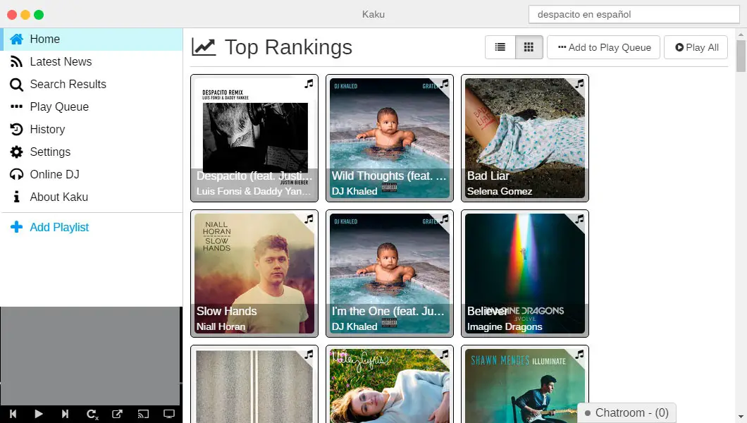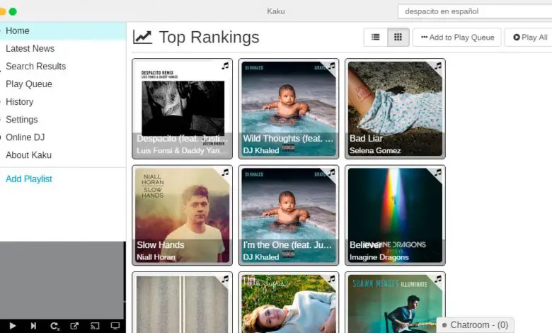 Lorsque nous lancerons Kaku, nous allons trouver une interface assez simple à utiliser. Sur le côté gauche, nous trouvons toutes les options de menu avec un espace réservé pour créer et ajouter des chansons à nos listes de lecture préférées et en bas un petit lecteur avec ses commandes est affiché et à partir duquel nous pouvons aller à la plate-forme dans le que la musique est trouvé, indiquer qu’il est répété ou envoyer à d’autres appareils par diffusion.