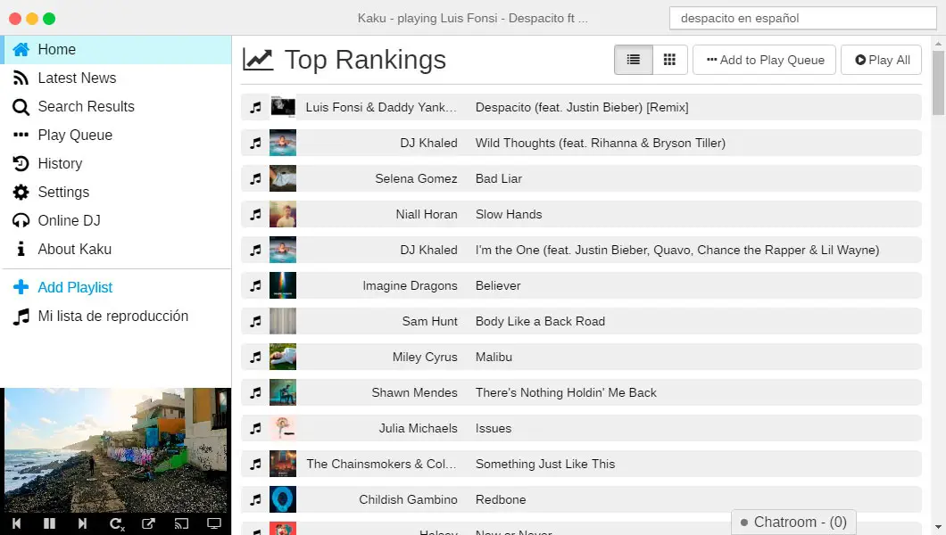 Dans la partie principale, les Top Rankings sont chargés par défaut , qui peuvent être affichés dans un plan en mosaïque ou une liste avec des détails et qui permet de savoir ce qui est le plus écouté dans différents pays. Il propose également un moteur de recherche pour rechercher et lire la musique que nous voulons sur YouTube, SoundCloud, Vimeo, Baidu, etc.