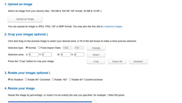 Por tanto, para poder trabajar con la misma, lo primero que haremos será pulsar en el botón “Upload an image” para subir a la aplicación web la foto que deseamos tratar, soportando formatos como JPG, BMP, o GIF. A continuación tendremos la oportunidad de recortar la imagen subida si así lo deseamos, aunque esto es algo opcional, bien haciendo la selección con el ratón, bien introduciendo los valores de las medidas a mano.