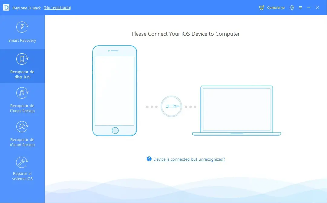 Dans le cas où il faudrait récupérer des données perdues, supprimées ou supprimées par erreur, nous choisirons la première option, puis le programme nous demandera de connecter notre iPhone ou iPad à l’ordinateur pour commencer à les analyser.
