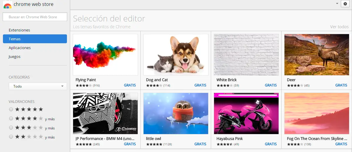 Comment pourrait-il en être autrement, Chrome Web Store est le site officiel sur lequel nous pouvons obtenir des thèmes gratuits pour Google Chrome.Il devrait donc être le premier site de référence à trouver un thème avec lequel personnaliser notre navigateur. Il possède une grande collection de sujets organisés par catégories et sur lesquels nous pouvons filtrer les mieux notés par les utilisateurs eux-mêmes.