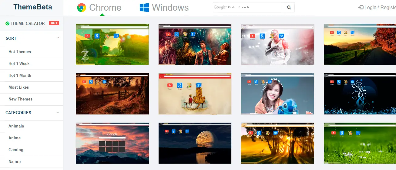 Un site entièrement dédié à proposer des thèmes pour personnaliser notre navigateur Google Chrome et par conséquent, il possède une large collection de thèmes. Comme dans le Chrome Store, il est possible de rechercher des sujets par mot-clé ou de filtrer les recherches par catégories. Chrome Themes a tous les thèmes organisés en 16 catégories différentes telles que les animaux, l’automobile, les dessins animés, les jeux, les célébrités, la nature, les films, etc.