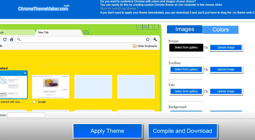Pour les plus créatifs ou ceux qui aiment pousser la personnalisation de leur navigateur plus loin, à partir de Chrome Theme Maker, ils pourront créer leurs propres thèmes pour le navigateur Google. Depuis l’interface de ce curieux site Web gratuit, il est possible de créer un thème avec notre propre galerie d’images, que nous pouvons ajouter à partir de l’onglet Images et où nous pouvons appliquer celles que nous voulons par défaut pour les cadres, la barre d’outils, les onglets et l’arrière-plan .