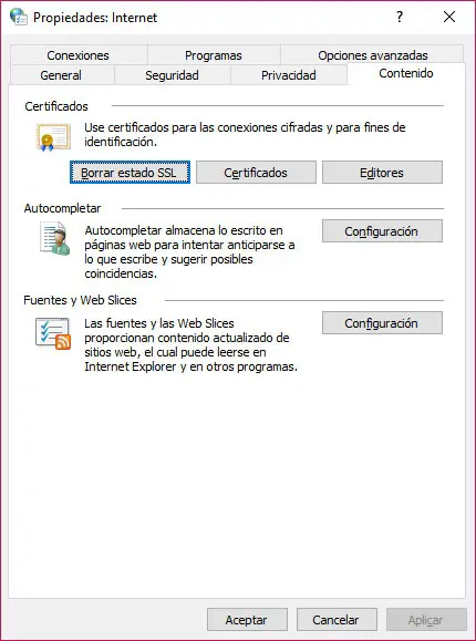 La solución entonces pasa por eliminar la caché SSL, por lo tanto, abrimos las opciones de Internet ejecutando el comando inetcpl.cpl en una ventana Ejecutar de Windows y nos vamos a la pestaña Contenido. Una vez ahí, sólo nos queda hacer clic sobre el botón Borrar estado SSL y automáticamente el sistema procederá con el borrado.