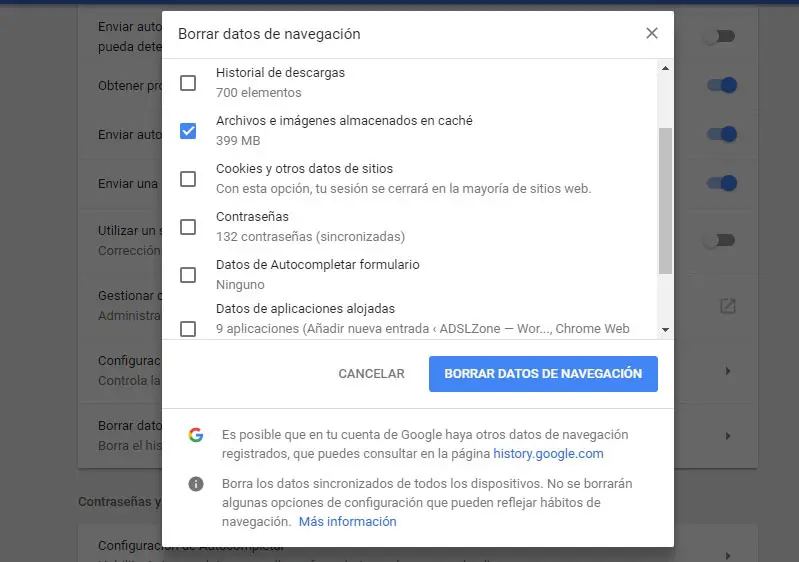 Una vez finalice la ejecución de todos ellos, reiniciamos el equipo y comprobamos si el error de Su conexión no es privada ha desaparecido. Si aún así todo sigue igual, lo único que nos queda es borrar la caché del navegador. Para ello, vamos a la configuración de Google Chrome y dentro de Privacidad y seguridad vamos a borrar datos de navegación y nos aseguramos de tener marcada la caché para que sea eliminada.