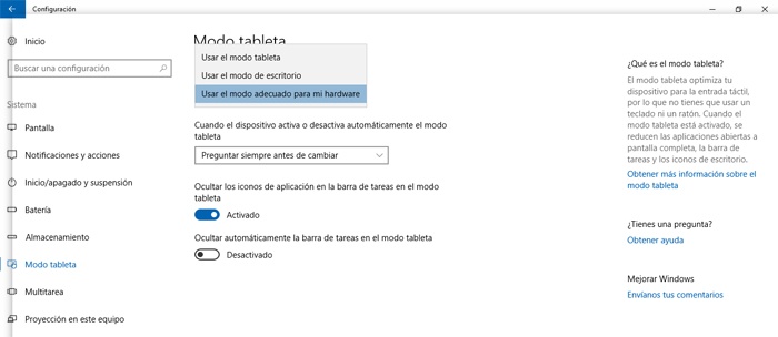 Par contre, et si cela ne fonctionne toujours pas, il est en même temps conseillé de désactiver le mode tablette sous Windows 10, car lorsque l’ appareil est dans ce mode de fonctionnement, nous ne pourrons pas voir ni accéder aux icônes ou des fichiers sur le bureau. Par conséquent, pour le désactiver, ouvrez d’abord la configuration du système avec la «touche Windows + I» et allez dans la catégorie » Mode système / tablette «, où nous sélectionnons » Utiliser le mode bureau «.