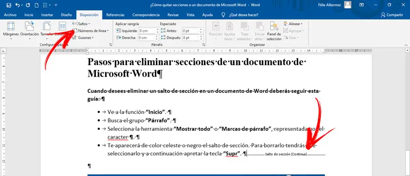 • Le saut de section apparaîtra en bleu ou en noir. Pour le supprimer, vous devrez le sélectionner puis appuyer sur la touche «Suppr» .