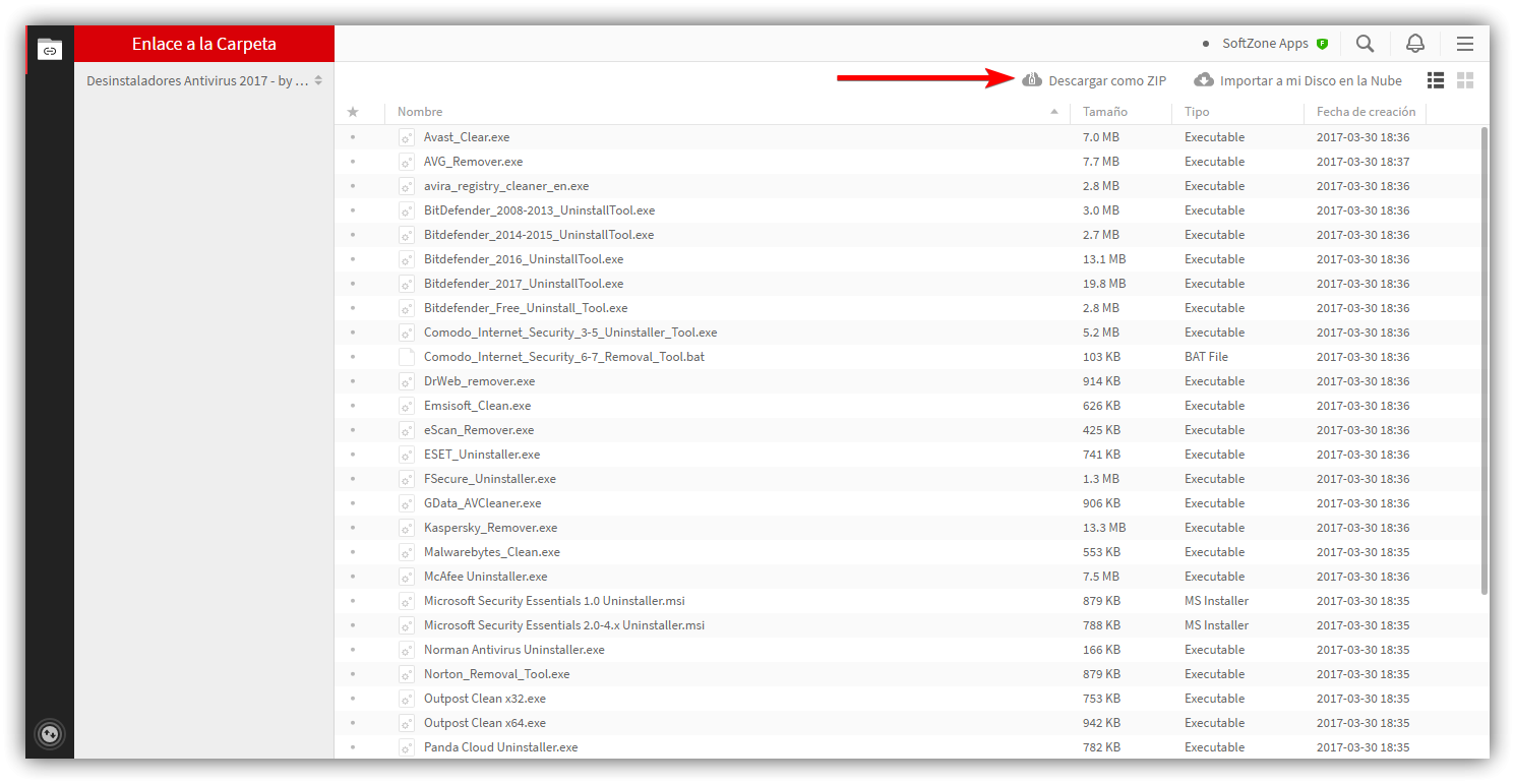 Vous pouvez y accéder librement à partir du lien suivant. Tous les programmes de désinstallation ont le nom de l’antivirus qu’ils vont désinstaller, et certains même la version pour laquelle ils ont été conçus. Vous pouvez télécharger celui que vous voulez simplement en double-cliquant dessus ou télécharger un zip avec chacun d’eux pour les avoir toujours à portée de main en cliquant sur le bouton « Télécharger au format Zip ».