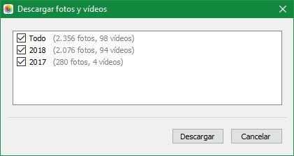 La fenêtre suivante s’ouvrira et nous trouverons deux dossiers: «Chargements» et «Téléchargements». En haut et à gauche, nous trouverons l’option «Télécharger des photos et des vidéos», cliquez ici et une nouvelle fenêtre s’affichera qui nous montrera les photos que nous pouvons télécharger sur l’ordinateur. Nous allons simplement sélectionner «Tous» et appuyer sur «Télécharger».