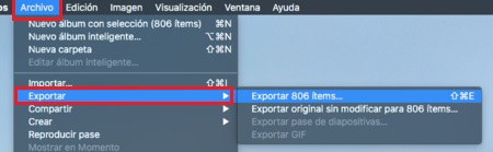 La première de ces deux options est «Exporter (X) éléments» qui nous permettra d’exporter toutes les images dans leur qualité d’origine, mais si vous en avez modifié une en utilisant l’application, elle conservera l’édition ajoutée.