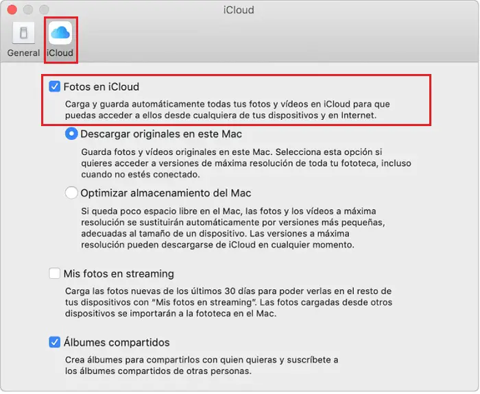 La première chose à faire est d’aller dans «Préférences Système»> «iCloud». Là, nous sélectionnerons «Options» à côté des photos et nous nous assurerons que nous avons coché l’option «Photothèque iCloud» ou «Photos iCloud».