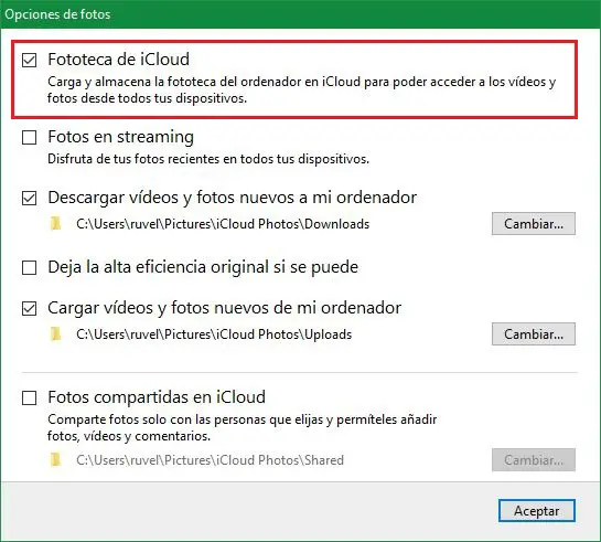 Nous devons également nous assurer que l’option «iCloud Photo Library» est active. Pour cela, nous entrerons «Photos» et s’il n’est pas activé, nous le sélectionnerons. Nous sélectionnerons également un dossier dans lequel nous enregistrerons le téléchargement de toutes nos photos.