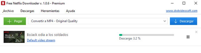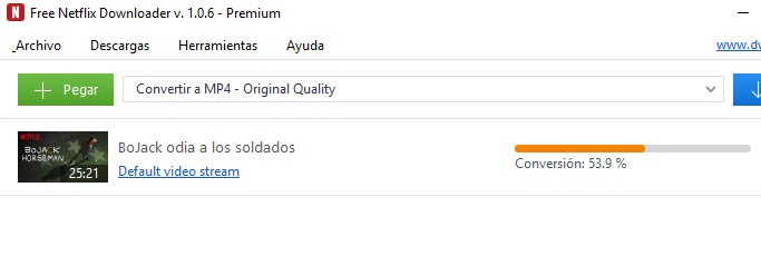Une fois que nous avons spécifié dans l’application la qualité que nous allons utiliser et cliqué sur le bouton « Télécharger», le processus commencera automatiquement, en fonction de la durée de la vidéo originale et de notre connexion, cela prendra plus ou moins de minutes, selon chaque cas. Gardez à l’esprit que Free Netflix Downloader vous permet d’effectuer plusieurs téléchargements simultanément et que, une fois qu’il a commencé, avec chacune des vidéos avec lesquelles nous avons affaire, il nous montrera les progrès réalisés pour nous donner un idée du temps que cela prendra.