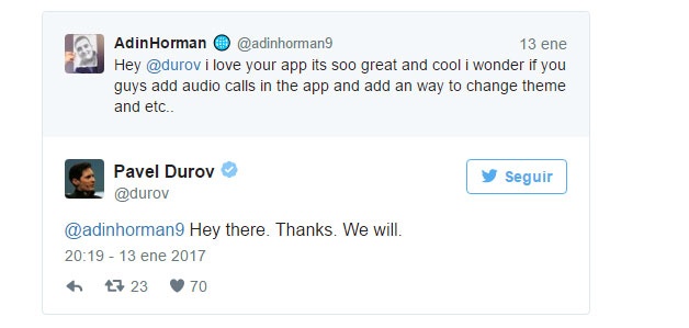 Cependant, comme nous venons de l’apprendre il y a quelques heures, il semble que le leader du secteur aura bientôt un concurrent de taille à cet égard, là encore de la main de Telegram. Et c’est quelque chose que le PDG de l’entreprise, Pavel Durov , a confirmé via son compte Twitter après qu’un utilisateur lui ait posé précisément cette question, si un jour Telegram aurait le service d’appel vocal.