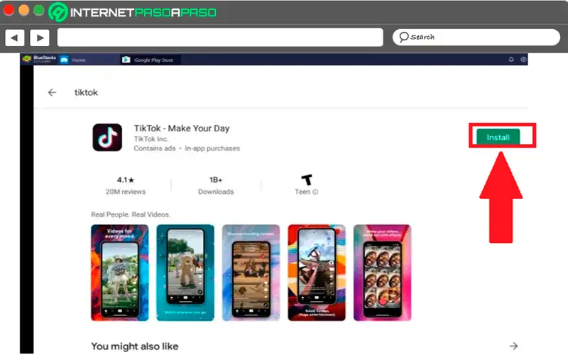 - Lorsque vous accédez au menu de la boutique en haut de l’écran, vous trouverez la barre de recherche , vous devez y taper TikTok pour accéder à l’application. Une fois que vous y êtes, vous devez cliquer sur le bouton «Installer».