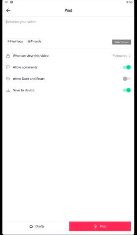 - Ensuite, vous devez sélectionner la partie inférieure droite de l’écran afin de pouvoir saisir les détails de la publication tels que la description de la vidéo, modifier les paramètres de confidentialité, activer les duos et les réactions.