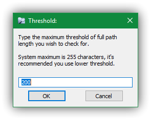 Dans notre cas, nous sélectionnons l’option «Oui» pour rechercher uniquement dans le lecteur C et le programme nous demandera le nombre maximum de caractères que nous voulons que chaque répertoire ait. Comme nous l’avons dit, Windows donne une erreur avec des répertoires de plus de 260 caractères , nous allons donc choisir une valeur (200, par exemple) avec laquelle nous avons une certaine marge et cliquer sur «Ok».