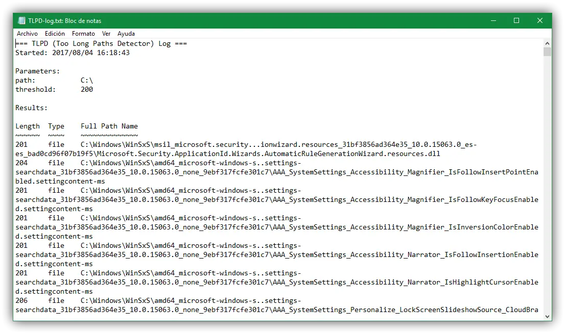 Le programme commencera automatiquement à analyser notre disque dur à la recherche de tout répertoire qui dépasse le nombre de caractères. Une fois terminé, le programme générera un fichier texte dans lequel tous les répertoires occupant plus que la limite établie apparaîtront.