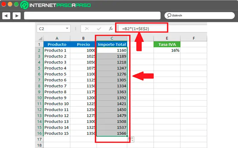 Dans ce cas, une valeur doit être multipliée par 116%, il est donc entendu que la valeur du pourcentage à augmenter est de 16%. Dans ce cas, la valeur du taux de TVA est dans la cellule E2 , afin de calculer le montant total de chacun des produits de la liste, la formule suivante doit être appliquée: = B2 * (1 + $ E $ 2).