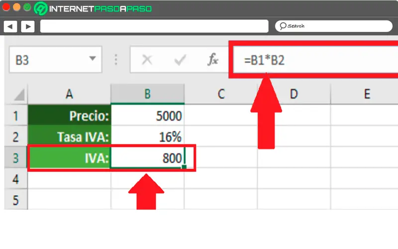 - Vous devez maintenant effectuer la multiplication de la valeur des cellules pour pouvoir obtenir le montant de la TVA , pour cela dans la section fonction vous devez placer la formule: = B1 * B2 , gardez à l’esprit que ces valeurs dépendent des cases que vous utilisez.