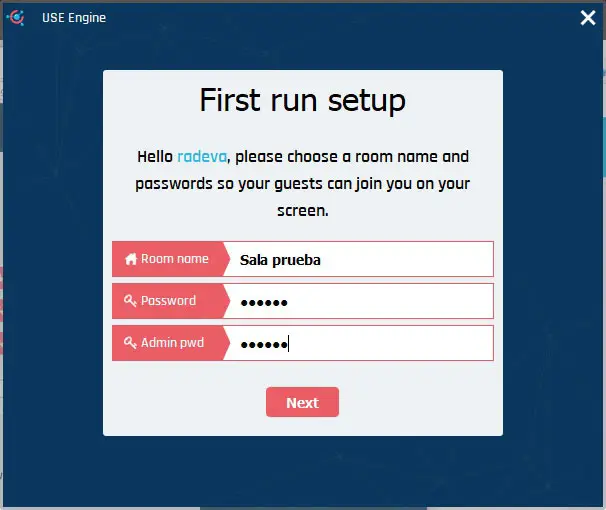 Pour commencer à utiliser USE Together, la première chose que nous devons faire est de télécharger son client et de l’installer sur notre PC, qui est le seul sur lequel nous devons installer quelque chose. Une fois que cela est fait, nous devons créer un compte puis configurer un nouvel espace ou une nouvelle salle pour commencer à partager l’écran. Nous devons indiquer un nom pour la salle, ainsi que le nom d’utilisateur et le mot de passe de l’utilisateur administrateur, qui sera celui qui partage l’écran.