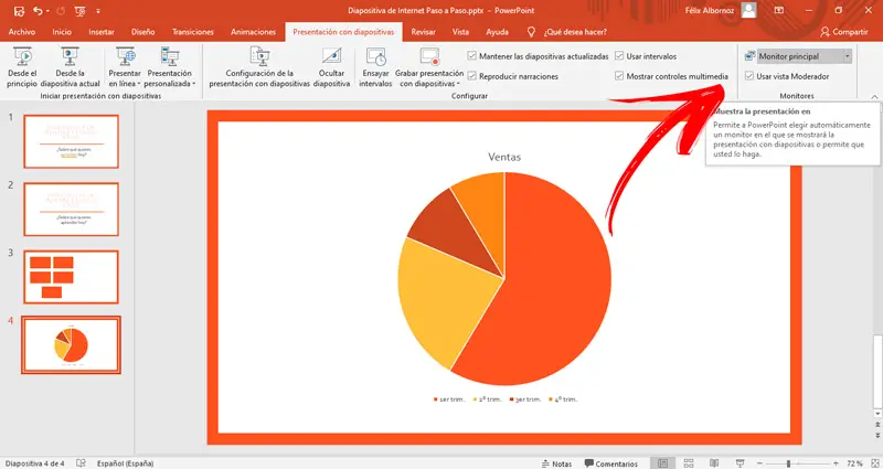 L’avantage de cet outil est que les lecteurs ne pourront pas voir les annotations faites par le présentateur, ils ne verront que les diapositives telles qu’elles ont été créées au début. Pour pouvoir exécuter cette fonction, il est nécessaire d’utiliser 2 écrans. De plus, cet outil a la possibilité d’occuper tout l’écran de l’ordinateur , donc des détails sur les hyperliens, les décalages dans les images et tout autre type d’action qui peut être corrigé avant que la présentation puisse être vue.