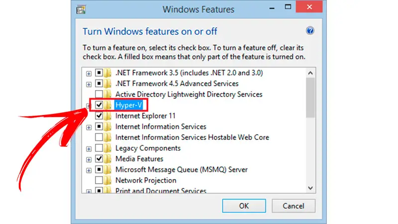 - Trouvez la case correspondante pour activer l’outil Hyper-V .