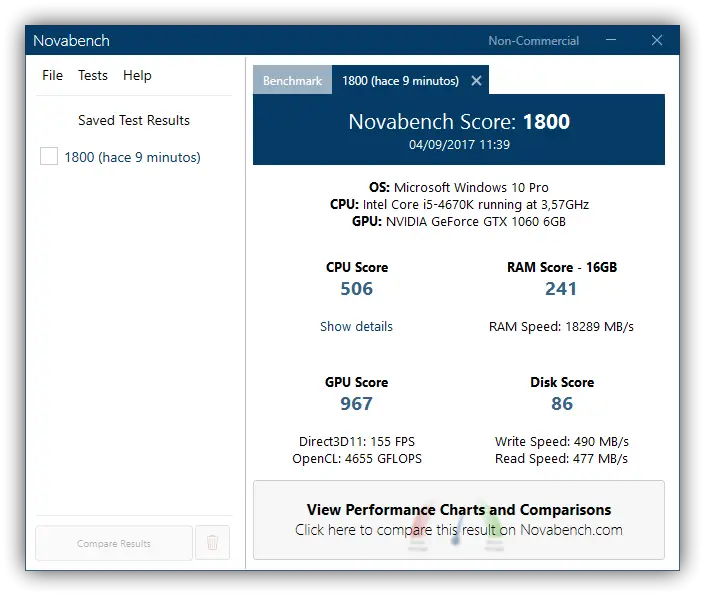 Une fois terminé, Novabench 4.0 nous montrera les résultats des tests , pouvant voir un score global de performance et un score spécifique pour chacun des 4 composants analysés. Comme nous n’avons pas de tableau de notation et que nous ne savons pas si, par exemple, 1800 est une bonne ou une mauvaise note, l’idéal est d’aller sur la page Web des statistiques et de rechercher les performances d’autres ordinateurs similaires. .