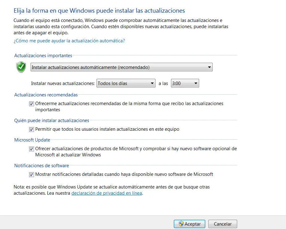 Si notre Windows 7 n’est pas à jour, nous devons effectuer le processus de mise à jour manuellement dès que possible (nous pouvons télécharger les derniers correctifs à partir du catalogue Microsoft Update, par exemple) et nous assurer que les mises à jour automatiques sont effectivement activées.