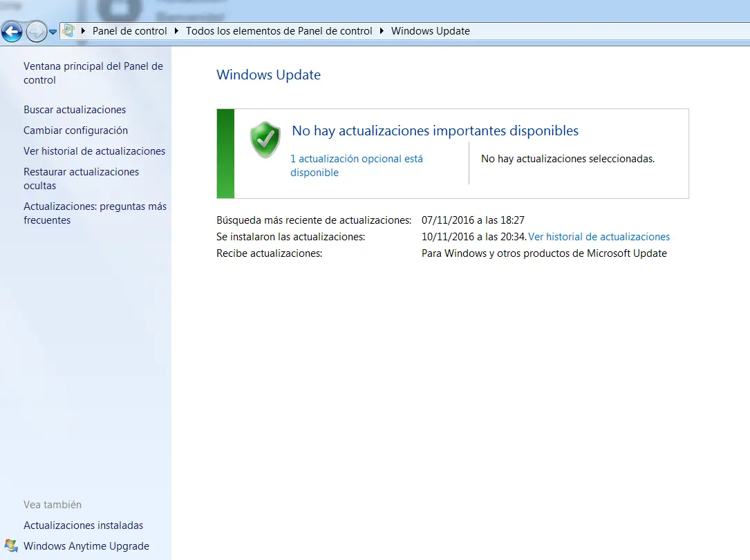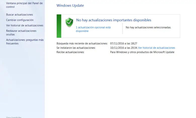 Dans cette fenêtre, nous pourrons voir s’il existe de nouvelles mises à jour pour notre Windows ou si elles sont toutes déjà installées. En outre, nous pouvons également voir la date à laquelle les dernières mises à jour ont été installées dans notre Windows 7 et, en outre, nous pouvons voir l’historique des mises à jour, d’où nous verrons une liste avec tous et si celles-ci ont effectivement été téléchargé et installé normalement.
