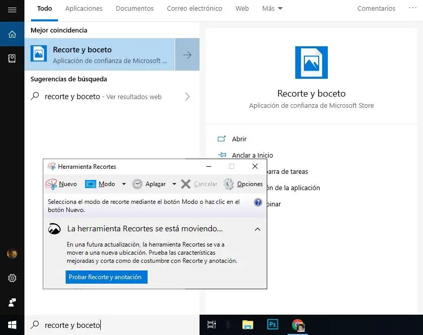 Par conséquent, pour ouvrir Snip & Sketch , il suffit de saisir son nom dans la zone de recherche de la barre des tâches. Il faut dire que si nous ouvrons le Snipping Tool actuel, il nous montrera un message accompagné d’un bouton qui nous permet d’ouvrir la nouvelle application.
