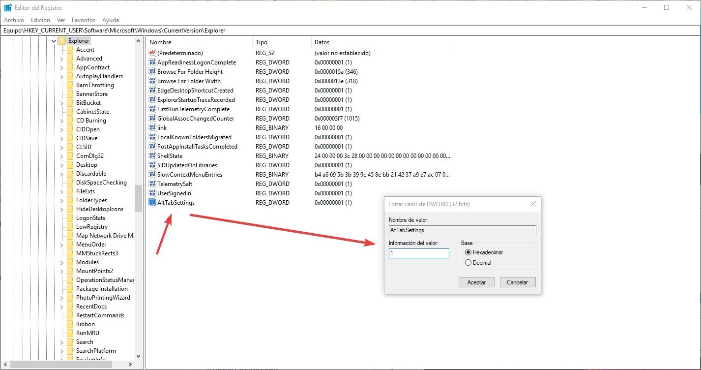Une fois ici, nous allons créer une nouvelle valeur DWORD 32 bits avec le nom » AltTabSettings » et, en double-cliquant dessus, nous lui donnerons la valeur «1» .