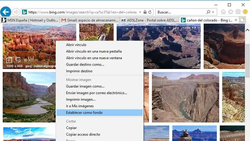 Maintenant, nous recherchons dans Bing ou Google une image que nous voulons définir comme fond d’écran, nous cliquons dessus avec le bouton droit de la souris et Internet Explorer lui-même nous montrera parmi les options du menu contextuel celui qui nous permet de définir cette image comme arrière-plan de l’écran ou de l’arrière-plan du bureau.