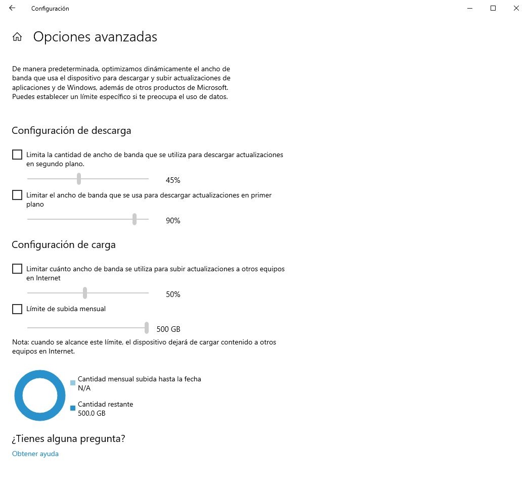 Jusqu’à présent, dans la section Paramètres> Windows Update> Optimisation de la livraison> Options avancées, nous pouvons trouver la possibilité de limiter relativement la vitesse de téléchargement et de téléchargement des mises à jour. Cela nous permet, par exemple, d’indiquer que nous voulons uniquement consacrer un pourcentage de notre bande passante aux mises à jour, et même de configurer une limite, en mégaoctets ou en gigaoctets, qui sera utilisée à cet effet.