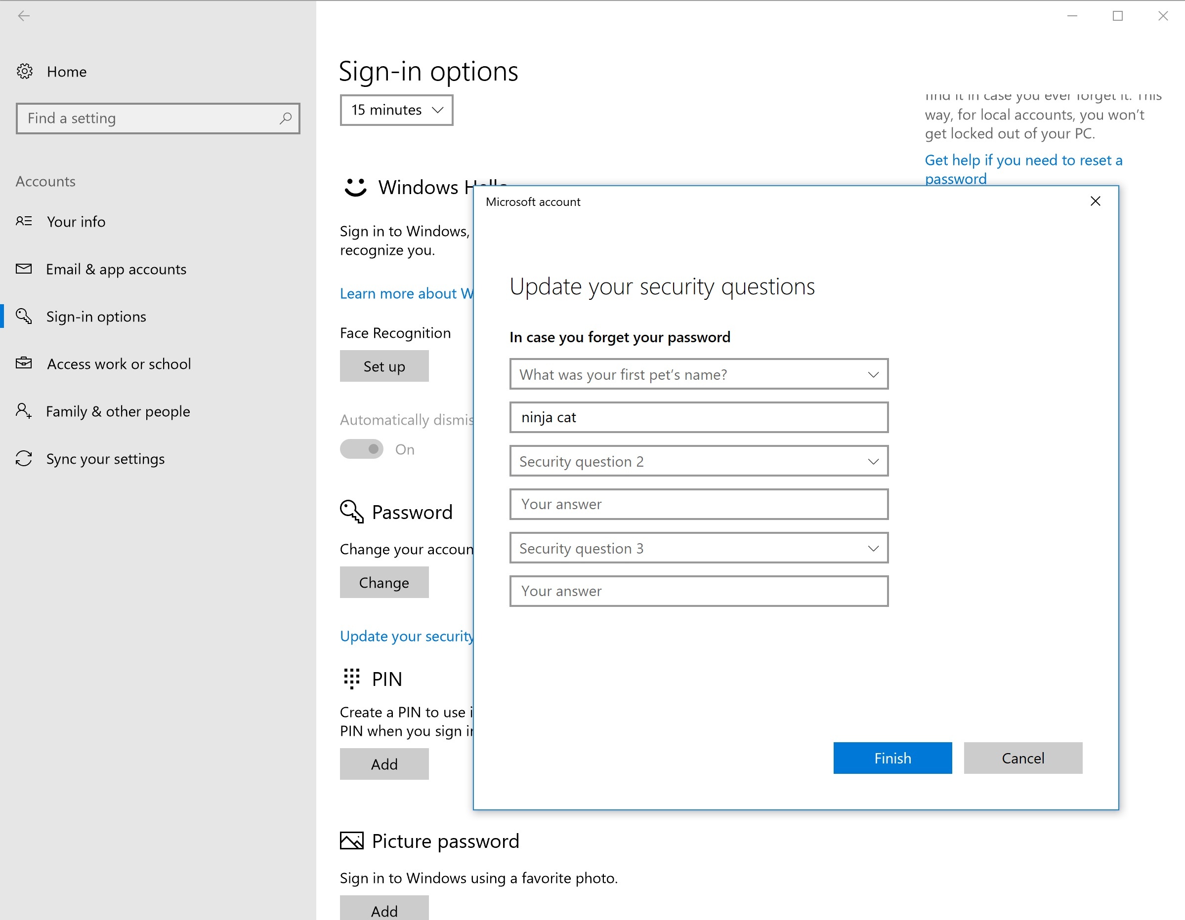 Windows 10 vous permettra de configurer des questions de sécurité pour récupérer le mot de passe de connexion
