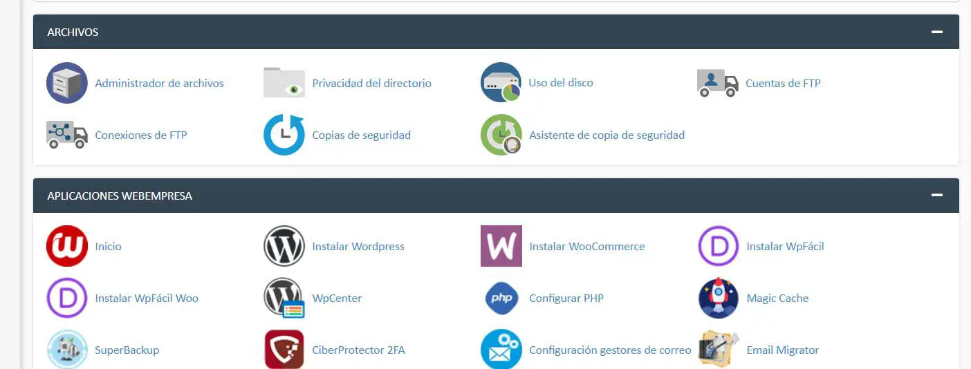 Pour cela, nous devons nous connecter avec nos données dans l’hébergement que nous avons contracté. Là, vous devrez entrer dans le panneau de contrôle. Les plus courants sont cPanel et Plesk. Lorsque nous sommes à l’intérieur, nous devons rechercher la section correspondante, qui est généralement Fichiers ou quelque chose de similaire. Dans notre cas, nous avons accédé via cPanel.