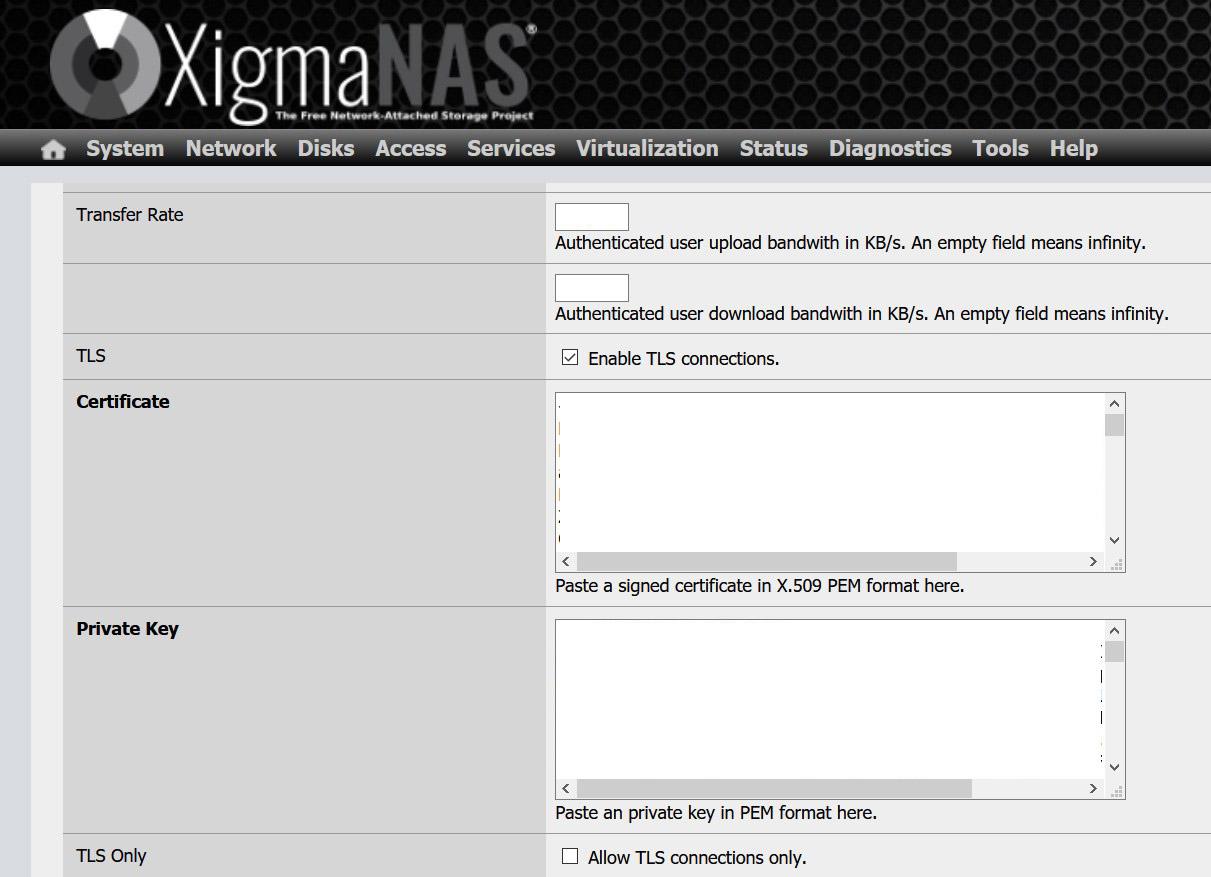 Dans l’image suivante, vous pouvez voir la configuration du serveur FTP dans le système d’exploitation XigmaNAS. Nous pouvons activer les connexions TLS, et nous devons indiquer un certificat ainsi que la clé privée associée. Enfin, il nous permet d’activer uniquement les connexions TLS, en rejetant les connexions FTP non cryptées «normales».