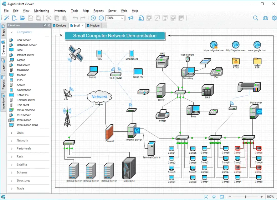 L’une de ses principales caractéristiques est de nous aider dans la visualisation . Ainsi, grâce à ce logiciel gratuit, nous pouvons visualiser confortablement l’infrastructure de notre réseau et y naviguer facilement. En ce sens, nous avons un éditeur de schéma de réseau informatique et nous pouvons même créer une carte de notre réseau de manière simple. De plus, il vous permet de créer des cartes géographiques qui vous permettent de positionner des appareils avec géoréférencement, de voir clairement leur emplacement géographique et d’importer et d’exporter des documents Visio.
