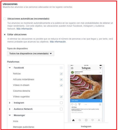 Maintenant, en premier lieu, vous avez l’option » Emplacements automatiques » et en la sélectionnant, le réseau social sera essentiellement celui qui décidera des endroits où vos annonces seront diffusées, avec l’objectif spécifique qu’elles aient de meilleures performances.