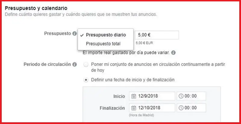 - Budget total : lorsque vous choisissez cette option, vous devez définir un budget global et spécifier une date de début et de fin pour l’exécution de la campagne. Si vous choisissez cette section, vous avez la possibilité de sélectionner des plages horaires spécifiques afin que vos annonces soient diffusées quand vous le souhaitez. Par conséquent, le budget est susceptible de s’épuiser rapidement et même de ne pas respecter le délai que vous avez défini.