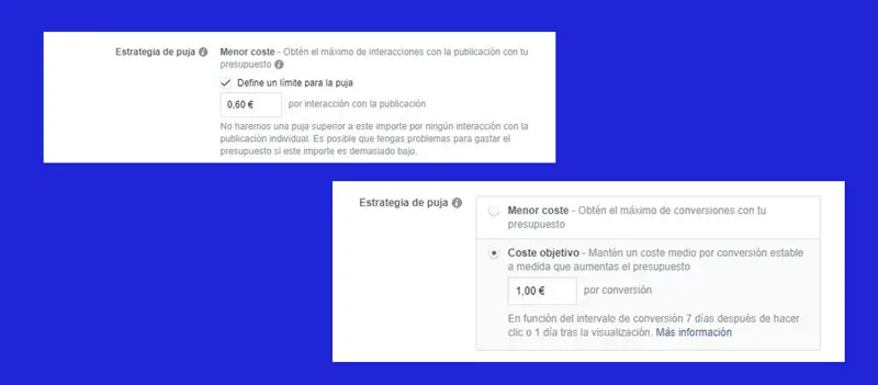 - Coût cible : il s’agit d’une option qui vous permet d’être facilement celui qui a la possibilité d’enchérir pour le coût moyen que vous souhaitez atteindre pour chaque conversion. Ceci est activé dans les objectifs initiaux, soit pour générer des leads, soit en conversions.