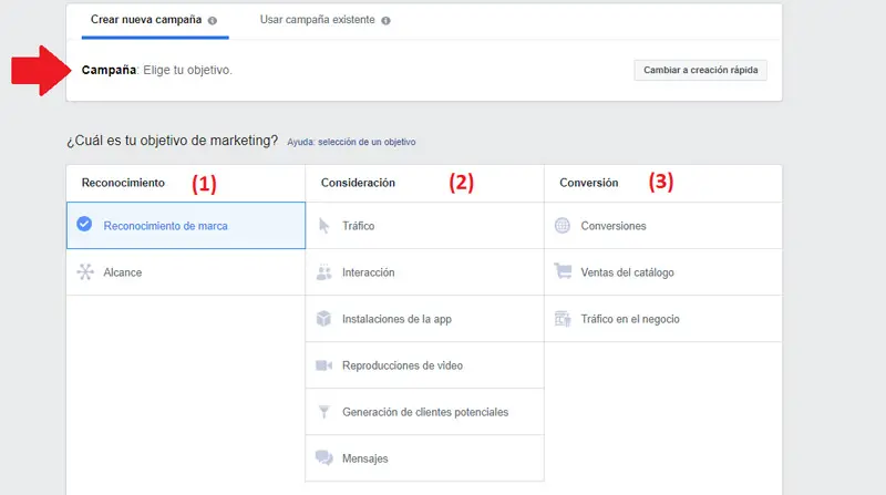 - Reconnaissance de la marque : En sélectionnant cette option, qui se situe en première position, vous travaillez à accroître la notoriété de votre marque. Avec quoi, Facebook vous garantit une forte probabilité d’atteindre les utilisateurs qui remarquent vraiment vos publicités et pas seulement sur cette plateforme sociale mais aussi sur Instagram.