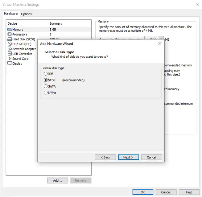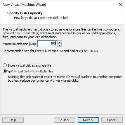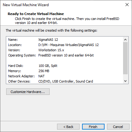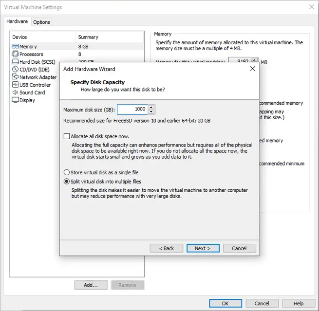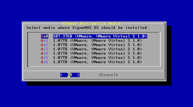Dans notre cas, nous allons installer ce système d’exploitation dans une machine virtuelle avec VMware, installer plusieurs disques durs virtuels et pouvoir configurer correctement le ZFS dont nous disposons dans le système d’exploitation. L’installation est typique du chargement de l’image ISO, de la sélection de FreeBSD x64 comme système d’exploitation et de la configuration des cœurs du processeur, de la RAM et, surtout, de 7 disques durs au total, le premier pour l’installation du système d’exploitation, et les 6 autres pour le stockage des données.