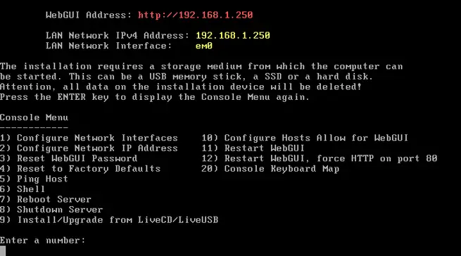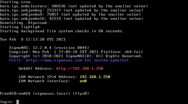 Lorsqu’il nous demandera de redémarrer le système d’exploitation, nous redémarrerons et il chargera automatiquement le système d’exploitation, nous devrons maintenant configurer l’interface réseau pour qu’elle obtienne l’adresse IP via DHCP. Cela se fait en entrant avec le nom d’utilisateur «root» et le mot de passe «xigmanas», nous choisissons l’option numéro 2 et suivons l’assistant, indiquant que nous voulons DHCP dans l’interface.