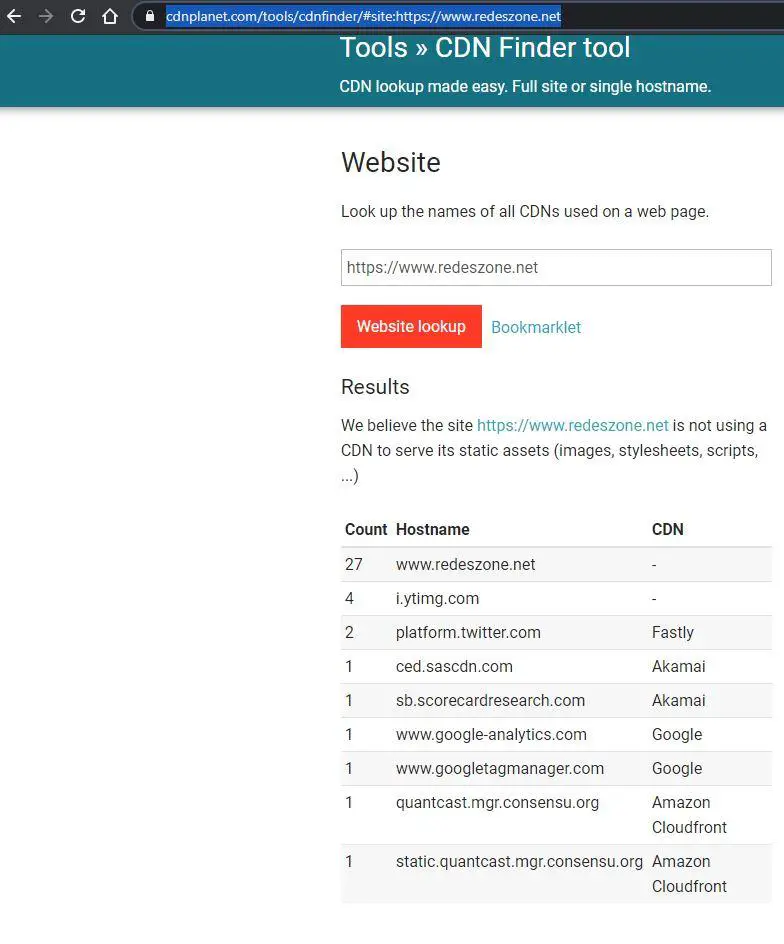 Il existe un outil appelé CDN Finder , de la société CDN Planet , qui va nous permettre de savoir si un certain site web utilise un CDN. Il s’agit d’un site Web qui ne nécessite pas de vous inscrire si vous souhaitez consulter des informations sur CDN. Entrez simplement l’URL et en quelques instants vous obtiendrez les informations souhaitées :