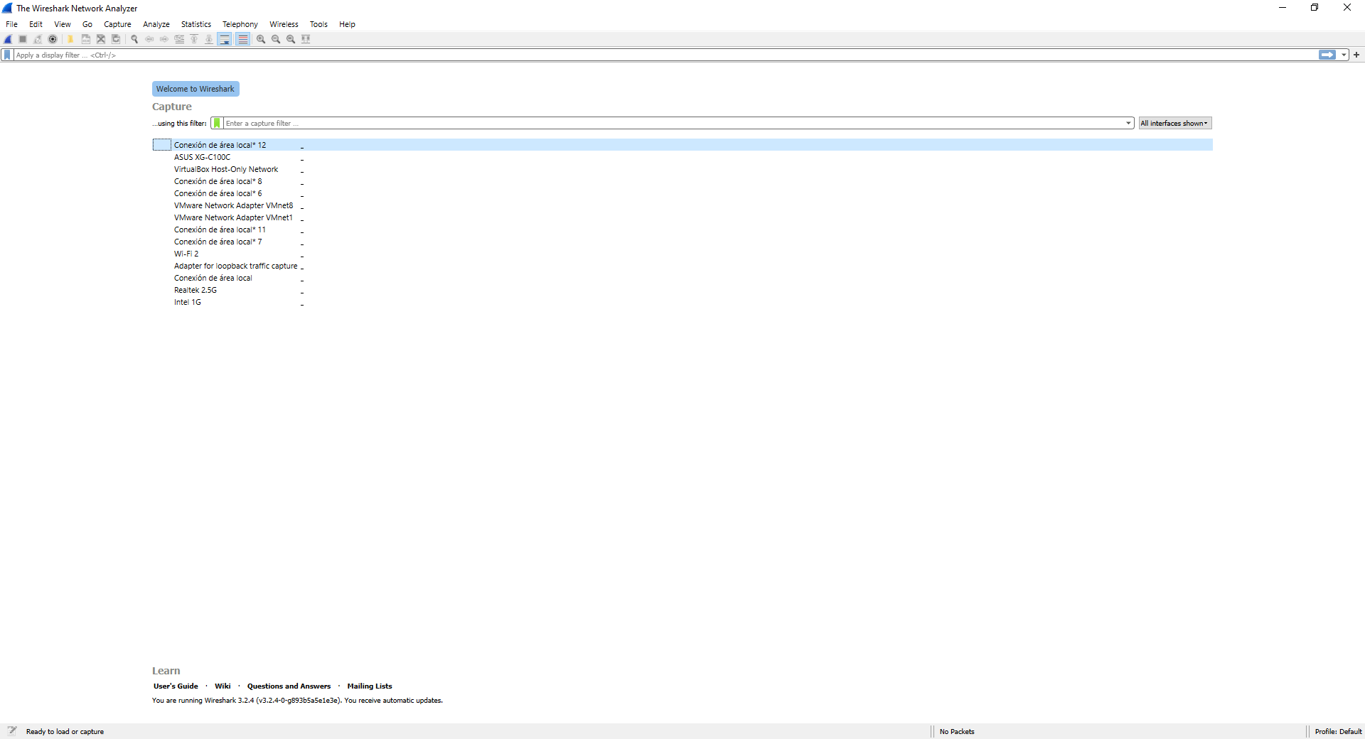 Nous avons utilisé le système d’exploitation Windows 10 pour capturer le trafic, mais sur les systèmes Linux ou macOS, c’est exactement la même chose, car nous avons exactement la même interface utilisateur graphique. La première chose que nous verrons au démarrage de ce programme sont toutes les cartes réseau et interfaces réseau de notre ordinateur, dans notre cas nous avons un total de trois cartes réseau filaires (ASUS XG-C100C, Realtek 2.5G et Intel 1G), une carte Réseau Wi-Fi (WiFi 2), en outre, nous avons différentes interfaces réseau virtuelles qui correspondent aux interfaces de VMware et Virtual Box.